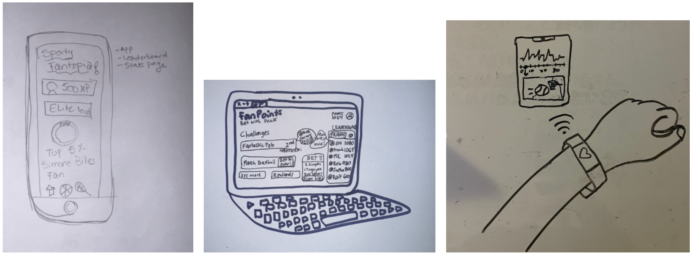 Ideation → Brainstormed multiple concepts (leaderboards, biometric trackers, fan points) before converging on the “hype-tracking” idea.